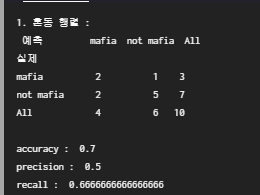 마피아(mafia)와 시민(not mafia)으로 분류된 혼동 행렬을 확인합니다.