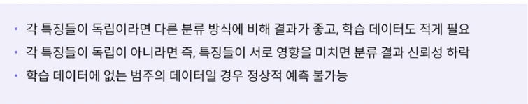 각 특징들이 독립적, 즉 서로 영향을 미치지 않을 것이라는 가정 설정, 베이즈 정리를 활용한 확률 통계학적 분류 알고리즘