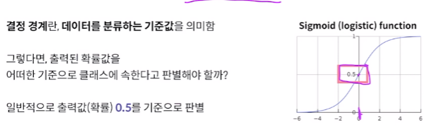 결정 경계 : 데이터를 분류하는 기준값, 일반적으로 출력값 0.5를 기준으로