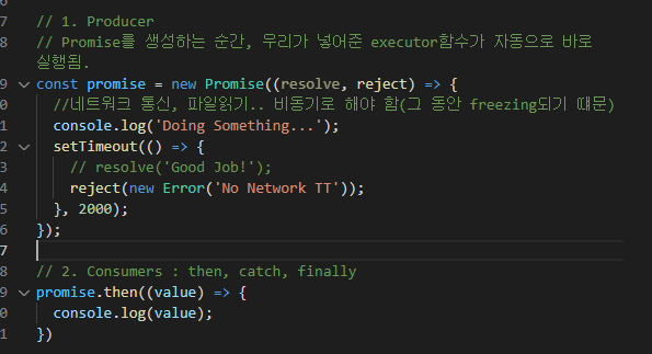 새로운 Promise가 만들어질 때, 우리가 전달한 executor = (resolve,reject)가 인자 라는 Callback 함수가 자동적으로 실행된다.