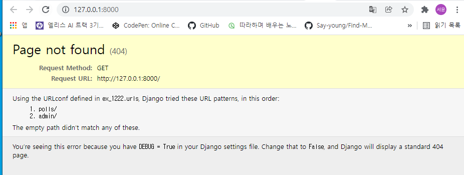 뒤에 URLconf? 패턴? 걔를 polls로 입력하니 얘가 페이지를 찾아서 아까 만든 뷰를 보여준다!