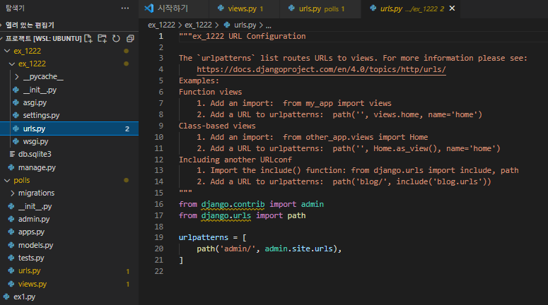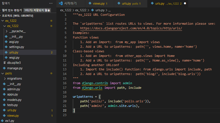 즉 내 파일에서는 ex_1222/urls.py에 django.urls.include를 import하고, urlpatterns리스트에 include() 함수를 추가한다.