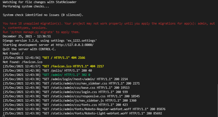 또한 runserver라는 저 명령에서 개발 서버는 요청이 들어올 때마다 자동으로 python 코드를 다시 불러온다.