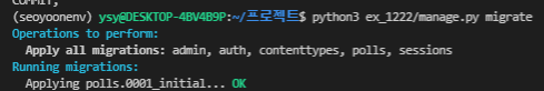 # 3 python3 manage.py위치 migrate 명령어로 변경사항을 데이터베이스에 적용한다.