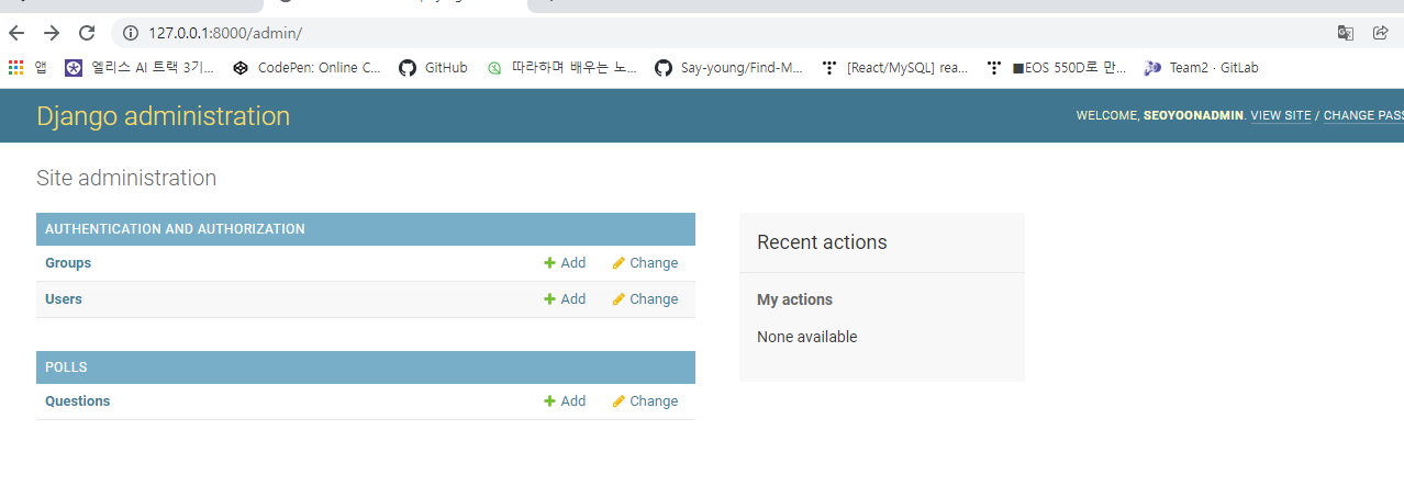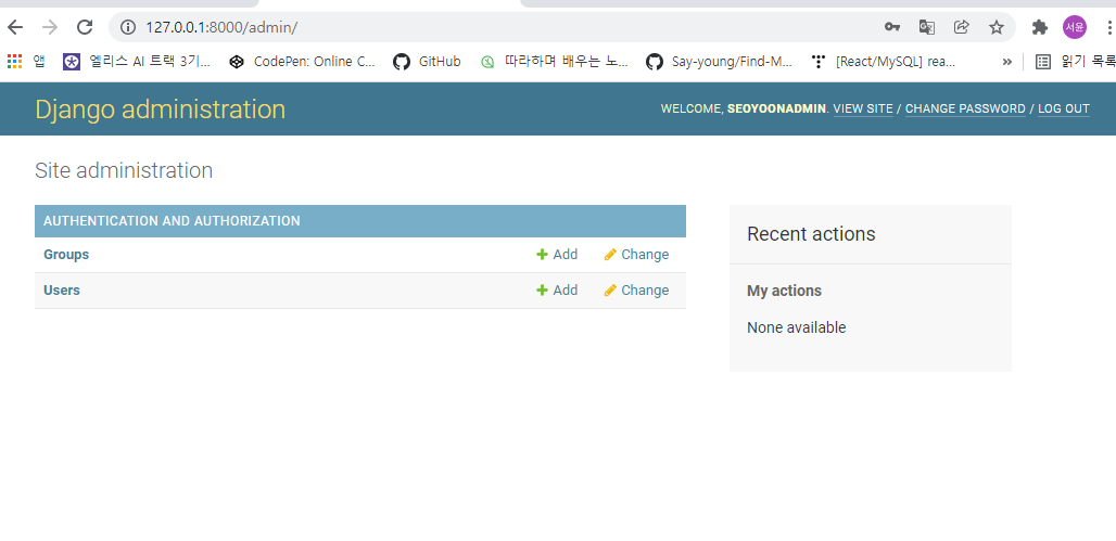 관리자(슈퍼유저)계정으로 로그인하면 다음과 같은 장고 관리 인덱스 페이지가 보인다.