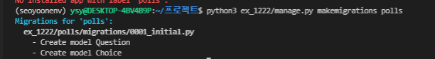 makemigrations를 실행시킴으로서 모델을 변경시킨 사실과(이 튜토리얼은 새로운 모델을 만듦) 그 변경사항을 migration으로 저장시키고 싶다는 것을 장고에게 알려준다.