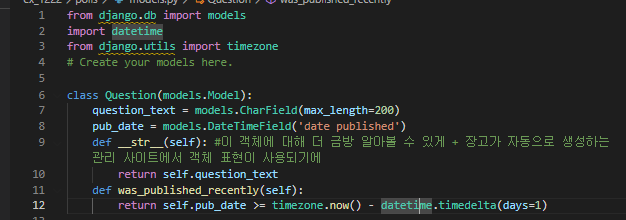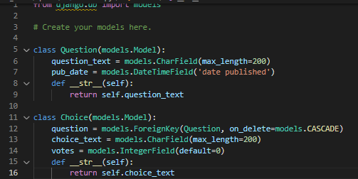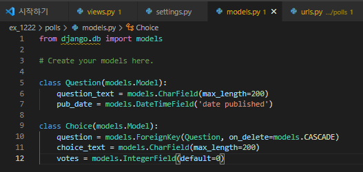 이런 개념은 파이썬 클래스를 의미한다. 이를 위해 polls/models.py 파일을 다음과 같이 수정하자.
