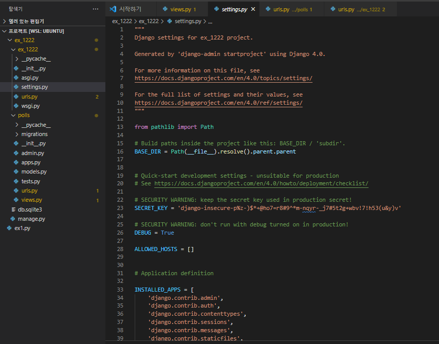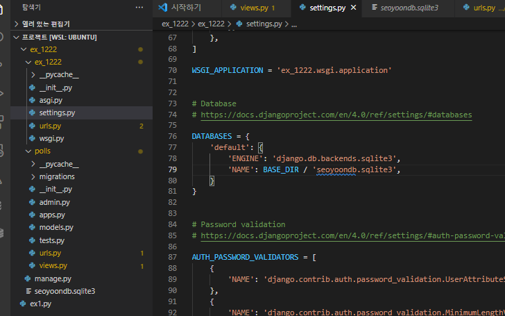 이제 ex_1222/settings.py를 열어서 데이터베이스를 설치한다.