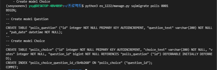 CREATE TABLE 'polls_choice' 어쩌구저쩌구 CREATE INDEX 어쩌구 COMMIT; SQL문을 실행한다.
