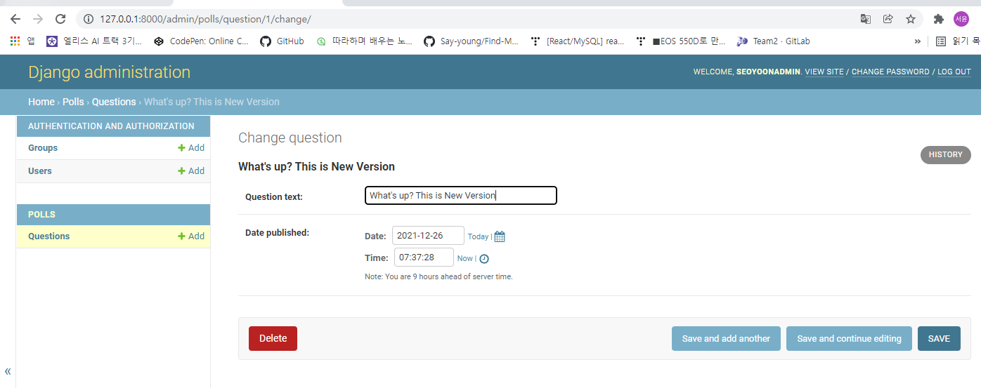 | 21.12.27 Django 튜토리얼 Part4 폼 쓰기, 제너릭 뷰 사용 (0) | 2021.12.27 |