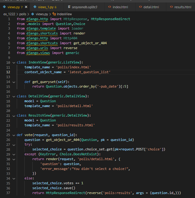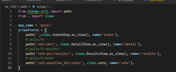 - DetailView 제너릭 뷰는 URL에서 캡처된 기본 키 값이 pk라고 기대하기 때문에 question_id를 제너릭 뷰를 위해 pk로 변경한다.
