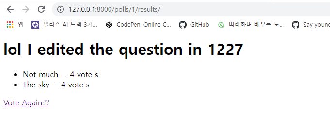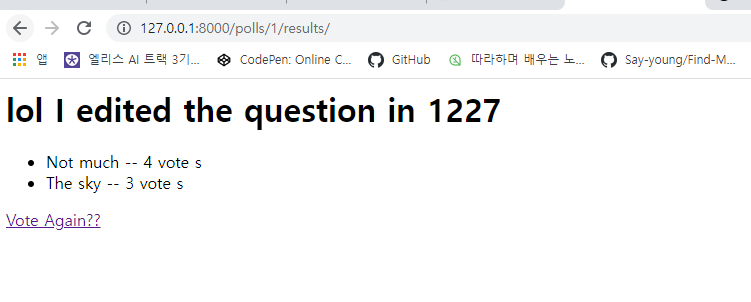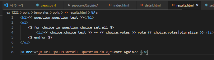 - (selected_choice.vote) 설문지의 수가 증가한 이후 코드는 일반 HttpResponse가 아닌 HttpResponseRedirect( 재전송 될 URL ) 함수를 실행한다.