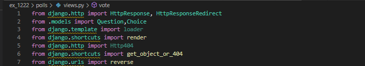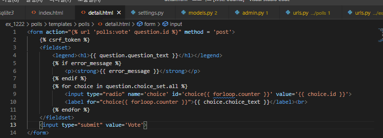- 만약 POST자료에 choice가 없으면 request.POST['choice'] 는 KeyError가 일어난다. try except 문으로 KeyError를 체크하고 choice가 주어지지 않는 경우에 에러 메시지와 함께 설문조사 폼을 다시 보여준다.