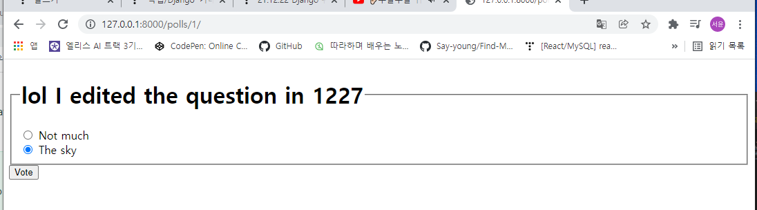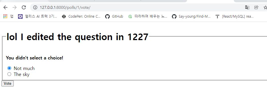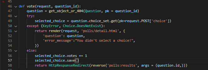 - 만약 POST자료에 choice가 없으면 request.POST['choice'] 는 KeyError가 일어난다. try except 문으로 KeyError를 체크하고 choice가 주어지지 않는 경우에 에러 메시지와 함께 설문조사 폼을 다시 보여준다.