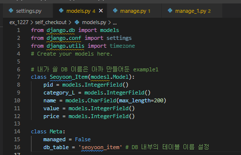 즉, models안에 있는 model들 (Seoyoon_Item과 Meta) 는 DB의 테이블이 되는 느낌인가보다