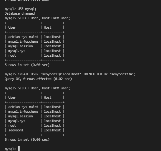 CREATE USER 'seoyoon1'@'localhost' IDENTIFIED BY '비밀번호';