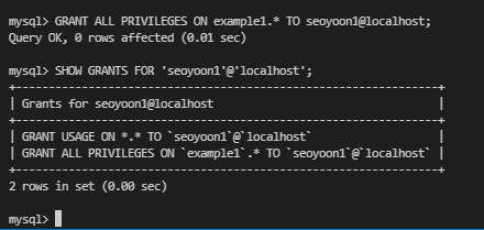 GRANT ALL PRIVILEGES ON example1.* TO seoyoon@localhost;