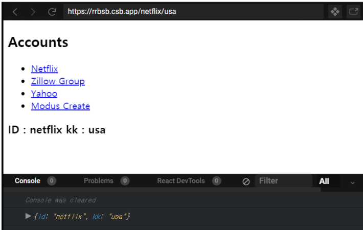 useParams는 URL 인자들의 key/value(키/값) 짝들의 객체를 반환한다. 현재 <Route> 의 match.params에 접근하기 위해 사용한다.