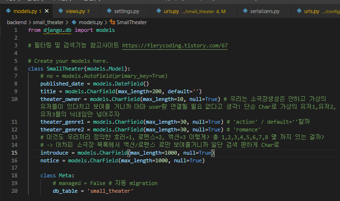 theater_owner = models.CharField(max_length=10, null=True) # 우리는 소극장생성은 안하고 가상의 유저들이 있다치고 보여줄 거니까 아마 user랑 연결될 필요 없다고 생각! 단순 Char로 가상의 유저1,유저2,유저3들의 닉네임만 넣어주자