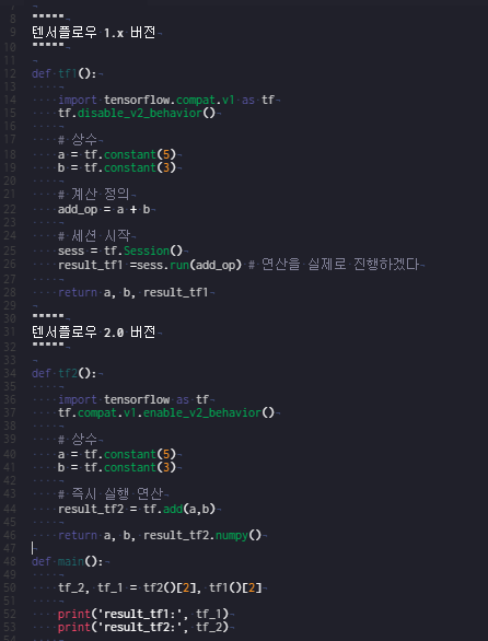 텐서플로우 version2는 즉시실행이 가능해서 계산그래프, 세션 생성 없이 실행이 가능하다.