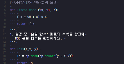2. MSE 값을 계산해 반환하는 손실 함수를 완성합니다.